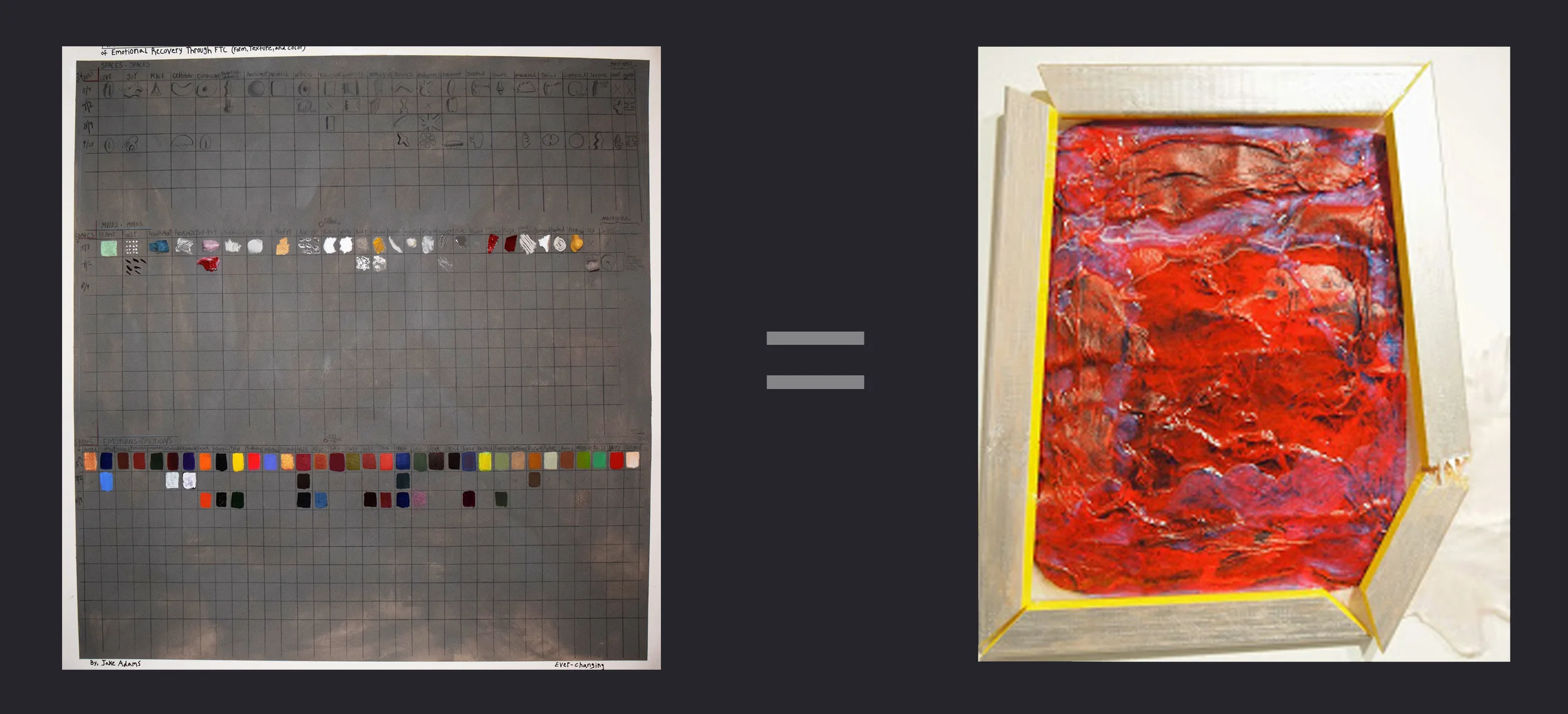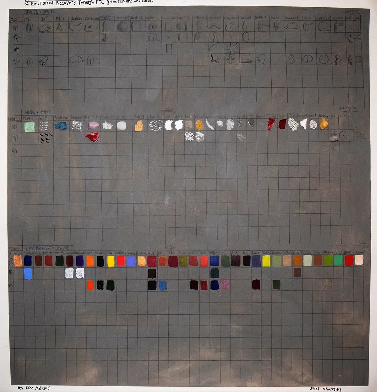 Jake Adams had been molding the above concept as a motif for his work, between the years 2013 to 2016. In order to yield a portrait of consciousness, Jake Adams used the concept of "the interview" to engage in mundane every day discourse with an individual. Through that performance he was able to sift through all of the feelings that were present in that interview. He then attached those feelings to three archetypes of affect and three different visual configurations of fruition. From the outside of the circle above and inward, those feelings include SPACES, EMOTIONS, and MOODS.